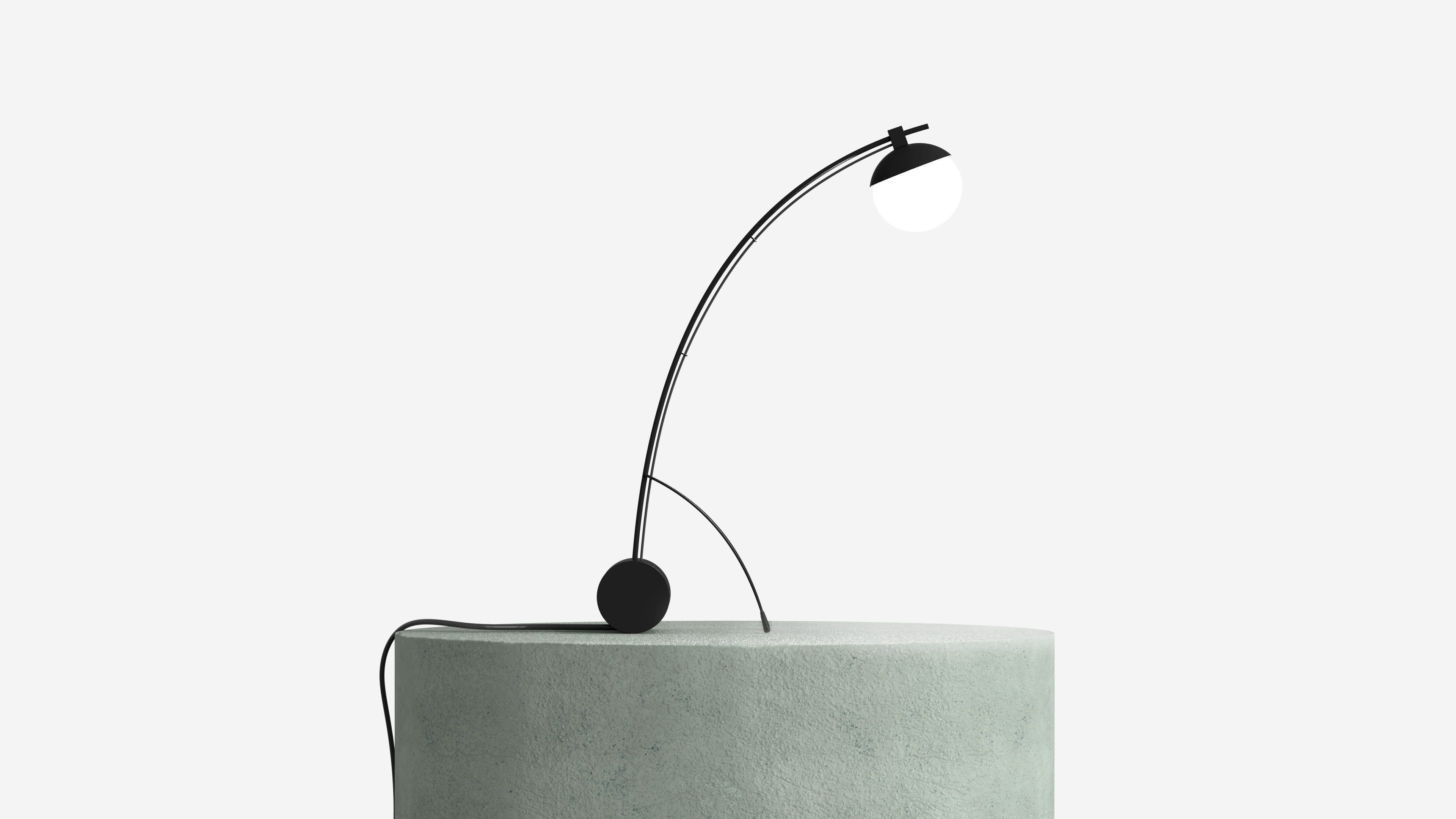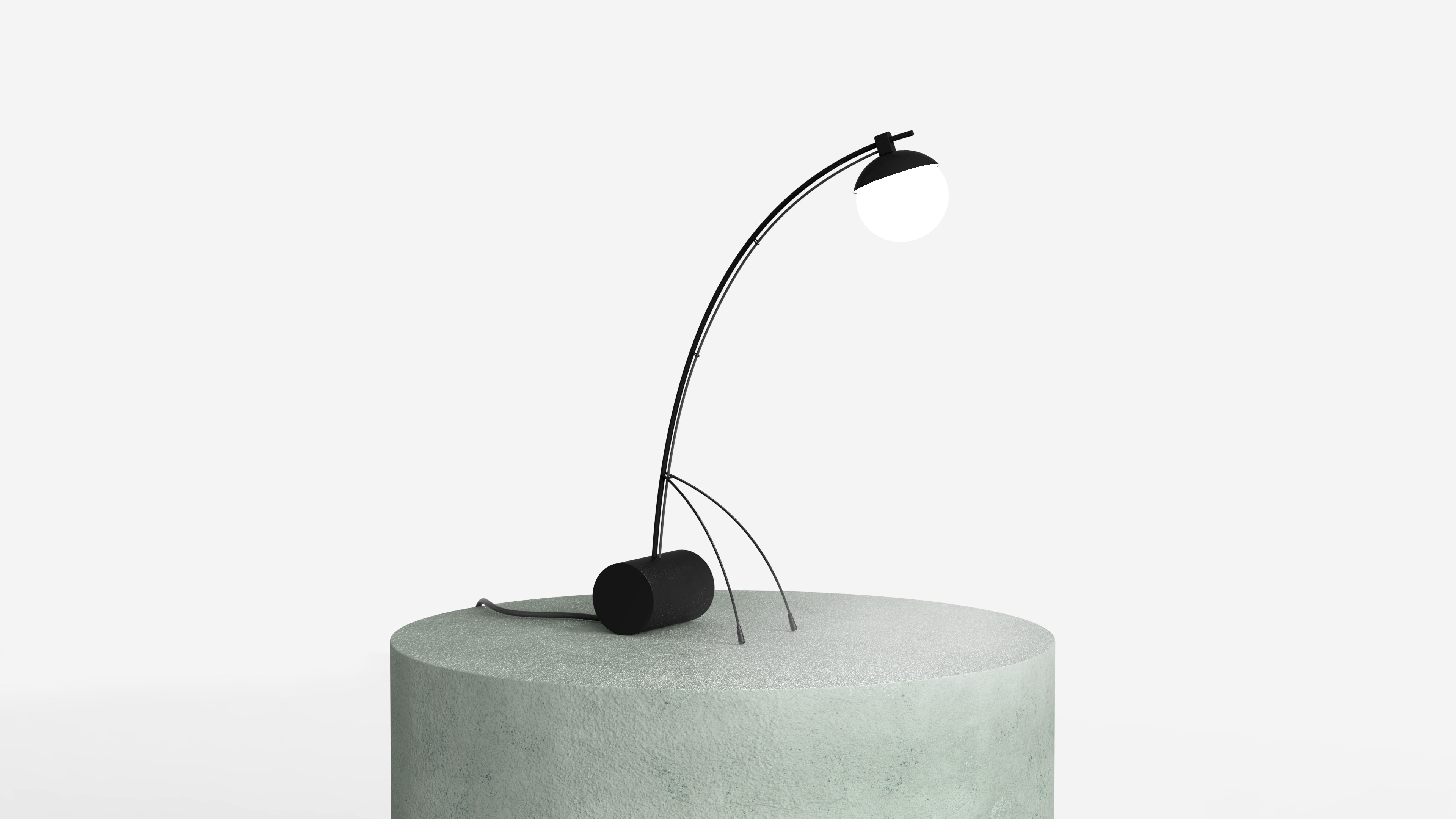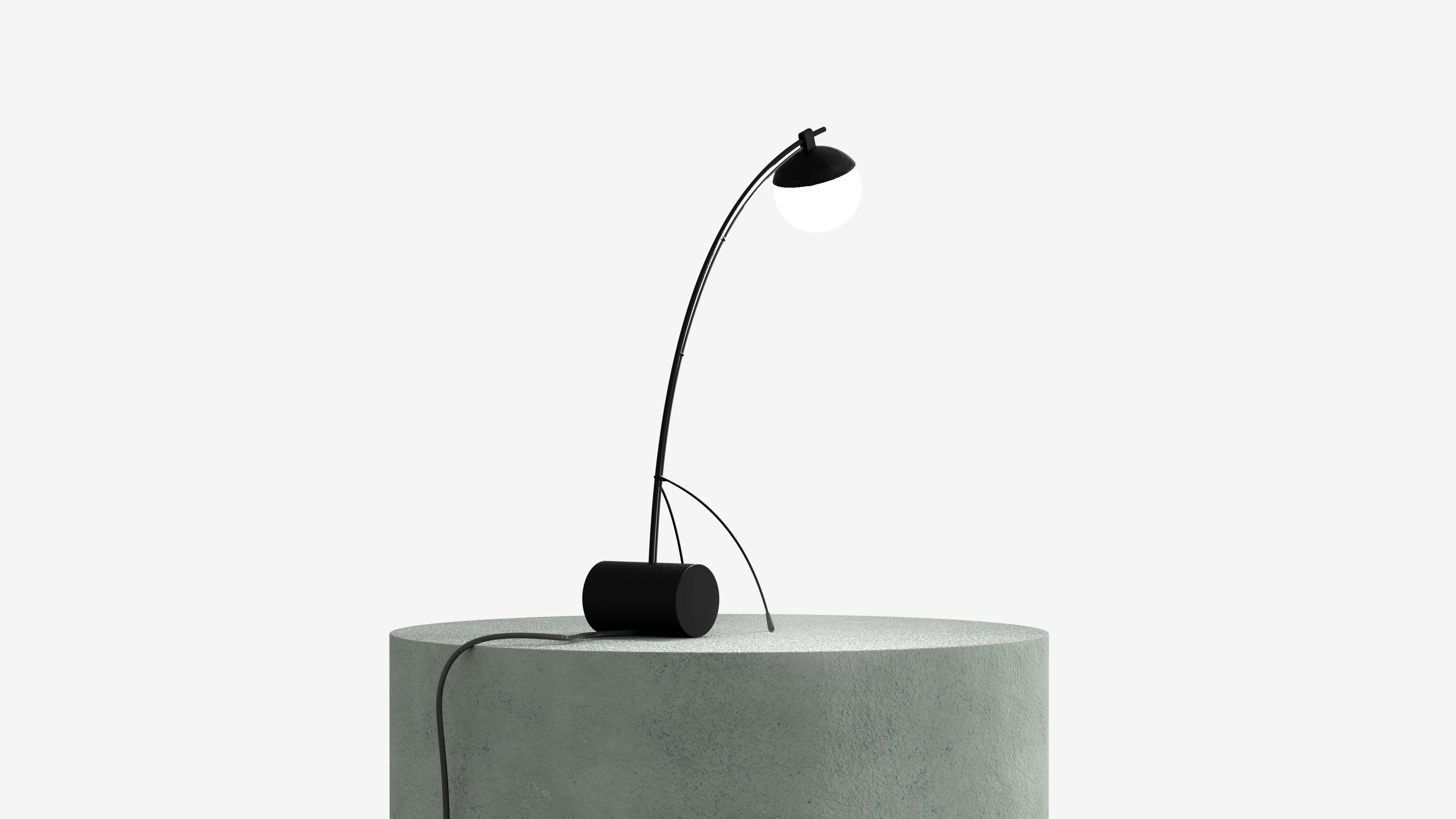 A lamp adjustable by the two thin arms that hold the structure. Moving them forward, in fact, it is possible to rotate the cylindrical base, which in rotation also allows you to tilt the light source and bring it closer to the surface to be illuminated.