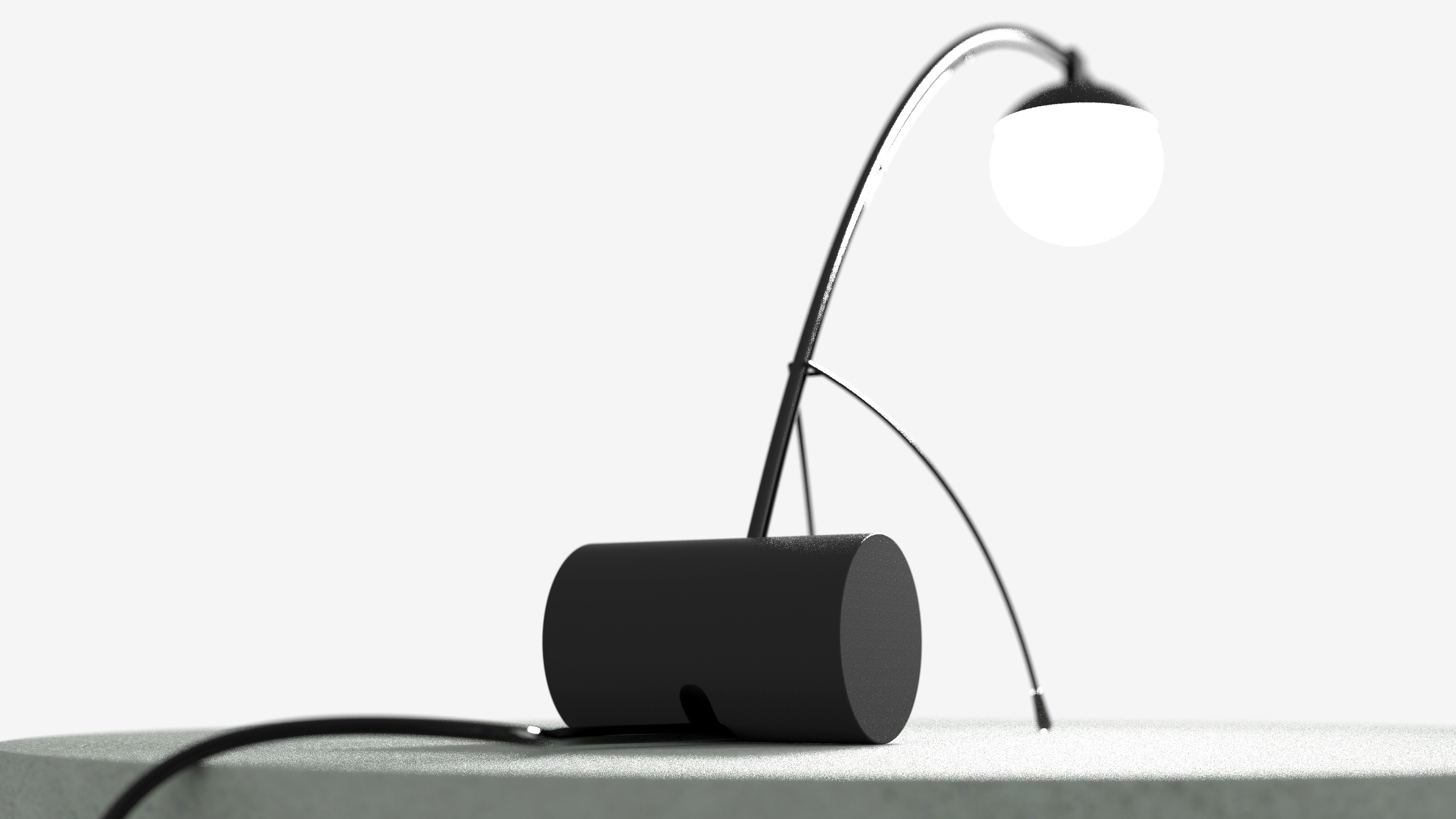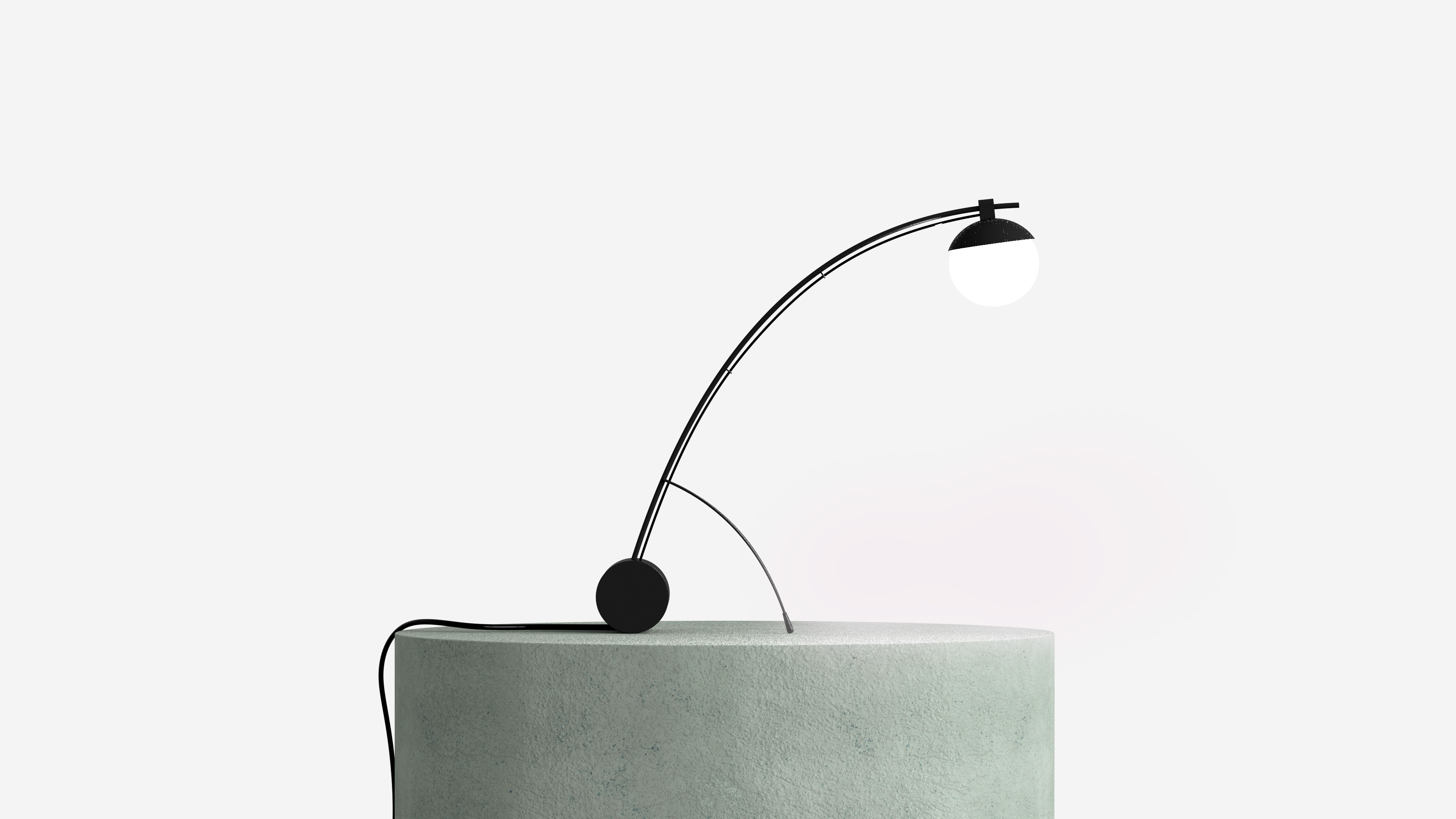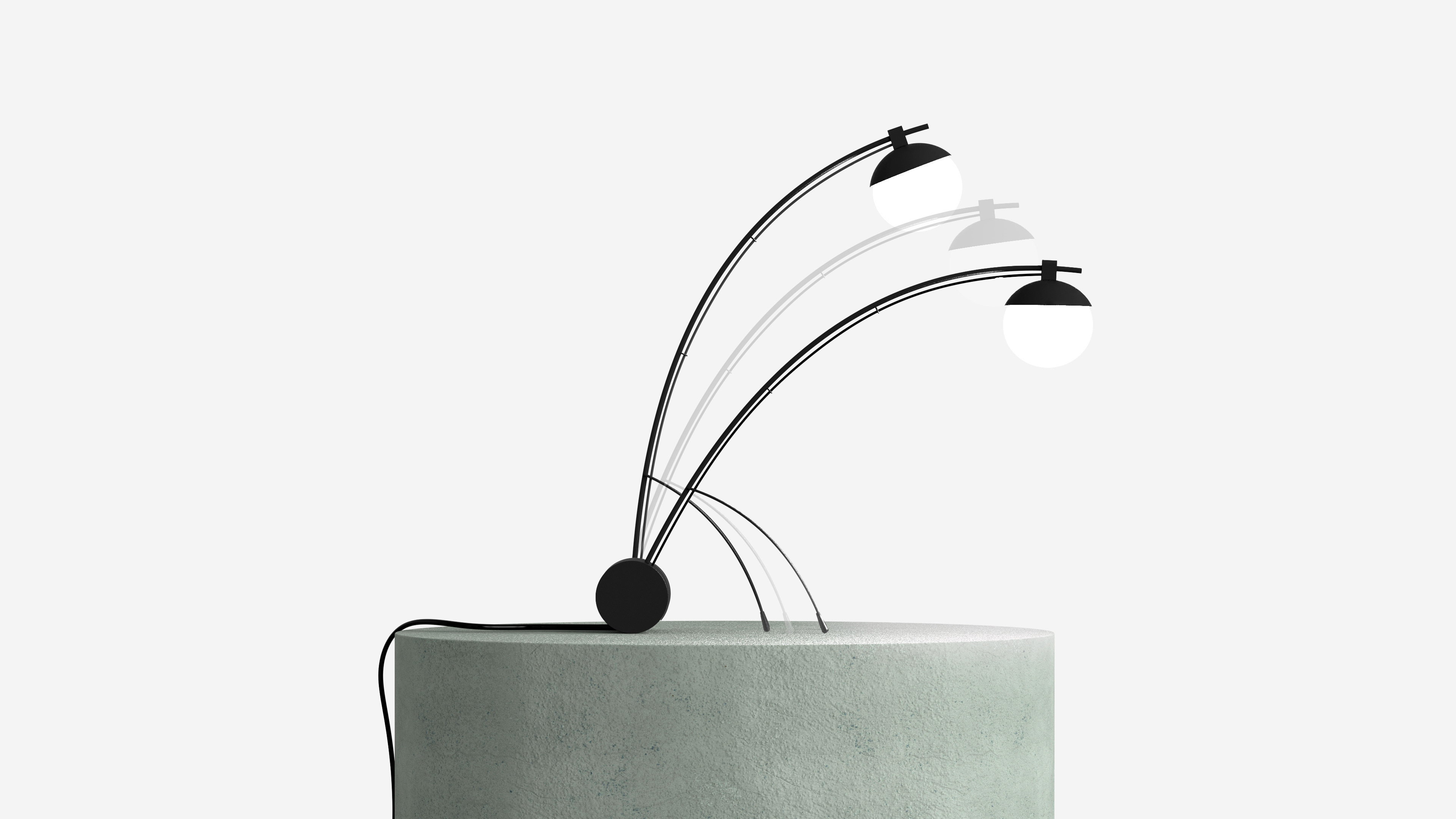 A lamp adjustable by the two thin arms that hold the structure. Moving them forward, in fact, it is possible to rotate the cylindrical base, which in rotation also allows you to tilt the light source and bring it closer to the surface to be illuminated.
